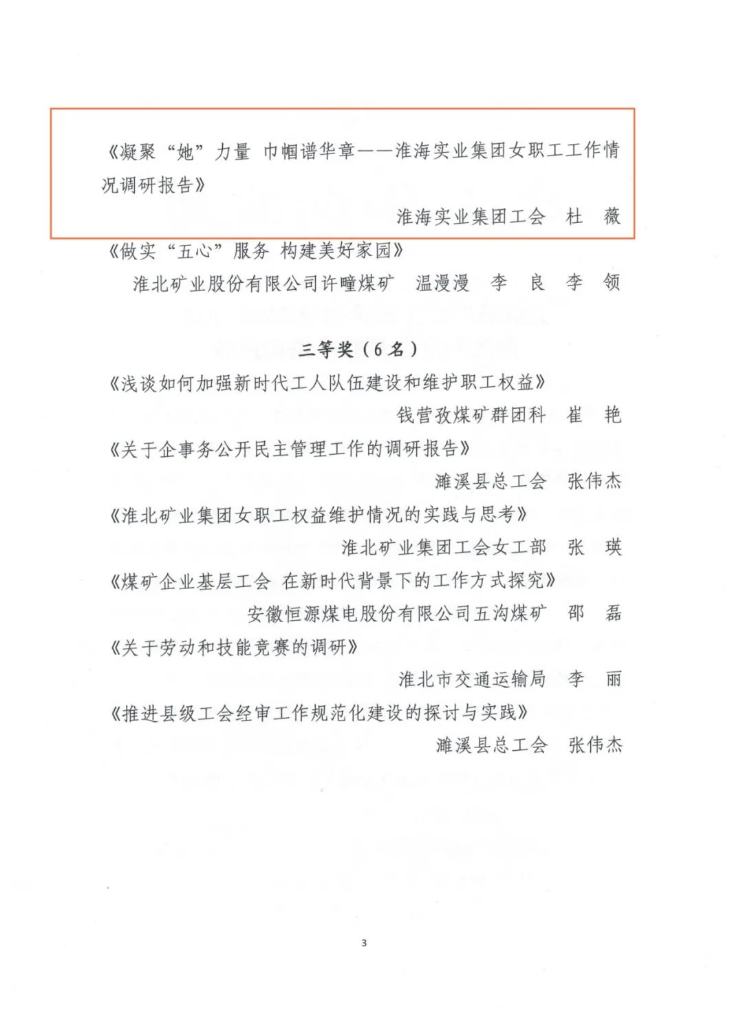 3月12日,筆者了解到,淮海實業集團工會榮獲淮北市2023年度“五型工會”勞動競賽一等獎、全市工會宣傳工作勞動競賽三等獎。《匯聚創新合力賦能高質量發展--淮海實業集團勞模(工匠、職工)創新工作室和技能大師工作室創建調研與思考》《凝聚“她”力量 巾幗譜華章--淮海實業集團女職工工作情況調研報告》兩篇調研報告分獲全市工會優秀論文和調研報告一、二等獎。